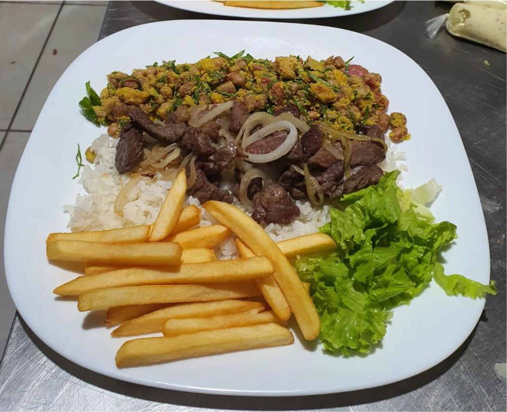 arroz, feijao tropeiro ou em caldo, fritas, salada