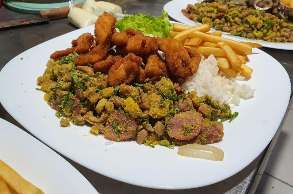 arroz, feijao tropeiro ou em caldo, fritas, salada