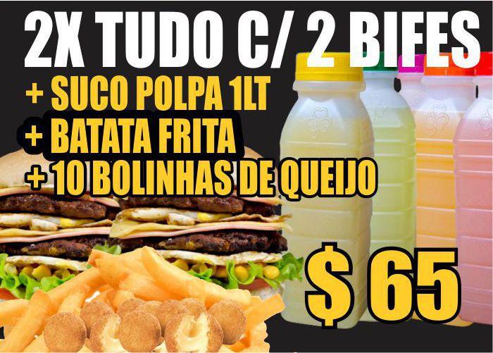 2x Tudo com 2 bifes+ suco polpa 1l+ batata frita+ 10 bolinhas de queijo
