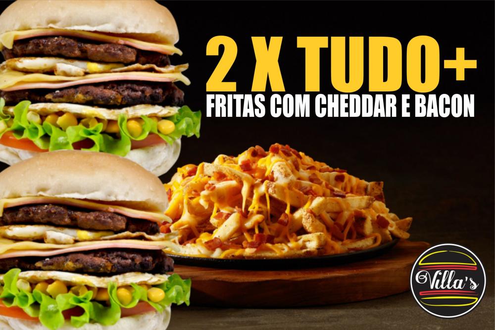 2x Tudo, fritas com cheddar e bacon, 10 bolinhas de queijo