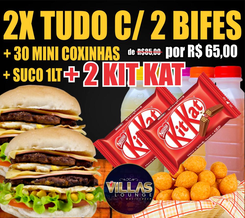 2 x Tudo com 2 bifes+ 30 mini salgadinhos+ suco 1lt ou refri 1lt + 2 KitKat